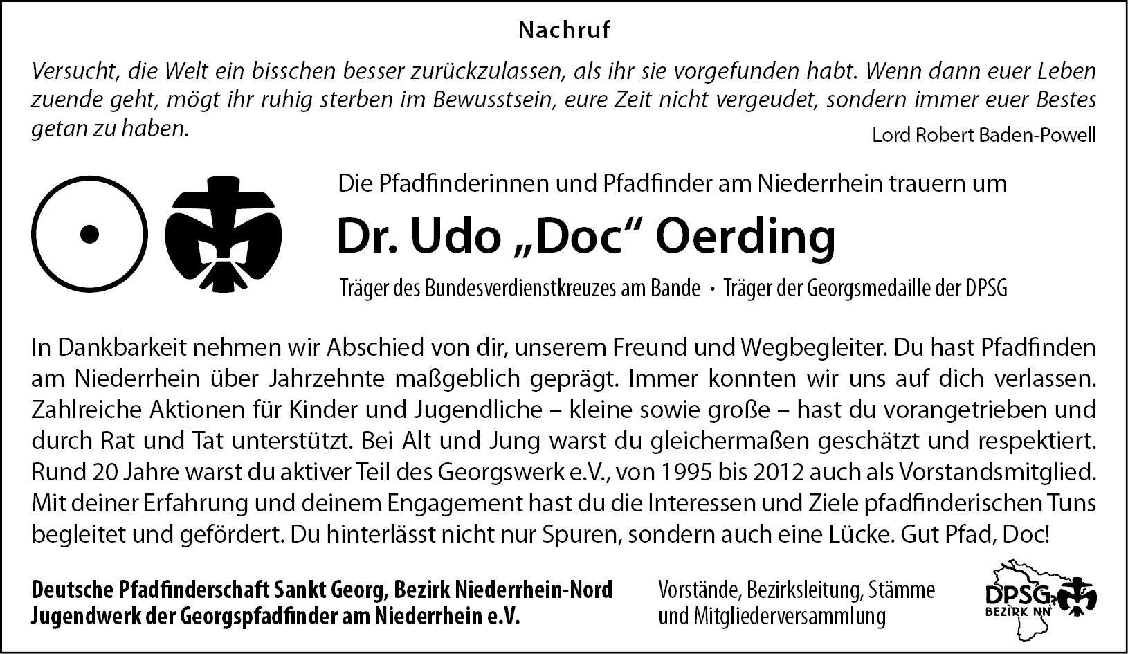 Mit großer Bestürzung erhielten wir am vergangenen Wochenende die Nachricht, dass ein Urgestein der Pfadfinderei am Niederrhein für immer von uns geggangen ist. Dr. Udo Oerding, Gründer des DPSG-Stammes in Geldern-Kapellen hat nach schwerer Krankheit losgelassen und ist friedlich im Kreise seiner Familie eingeschlafen. Damit geht ein guter Freund, der lange die pfadfinderische Arbeit am Niederrhein durch seine Einzigartigkeit geprägt hat.